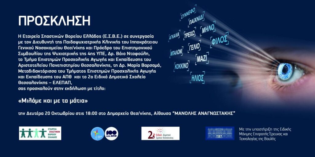 Η Εταιρεία Σπαστικών Βορείου Ελλάδος (Ε.Σ.Β.Ε.) σε συνεργασία με τον Διευθυντή της Παιδοψυχιατρικής Κλινικής του Ιπποκράτειου Γενικού Νοσοκομείου Θεσσαλονίκης και Πρόεδρο του Επιστημονικού Συμβουλίου της Ψυχιατρικής της 4ης ΥΠΕ, Δρ. Βάιο Νταφούλη, το Τμήμα Επιστημών Προσχολικής Αγωγής και Εκπαίδευσης του Αριστοτελείου Πανεπιστημίου Θεσσαλονίκης, τη Δρ. Μαρία Βαρσαμά, Μεταδιδακτόρισσα του Τμήματος Επιστημών Προσχολικής Αγωγής και Εκπαίδευσης του ΑΠΘ και το 2ο Ειδικό Δημοτικό Σχολείο Θεσσαλονίκης – ΕΛΕΠΑΠ, διοργανώνει εκδήλωση με τίτλο: